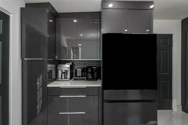The main level features striking granite slab flooring, a dramatic floor-to-ceiling granite fireplace, and open-concept living and dining areas perfect for entertaining. The chef’s kitchen boasts light pearl granite countertops, 42-inch modern cabinetry, a built-in microwave and new oven, a small granite coffee bar, and ample storage for all your needs.