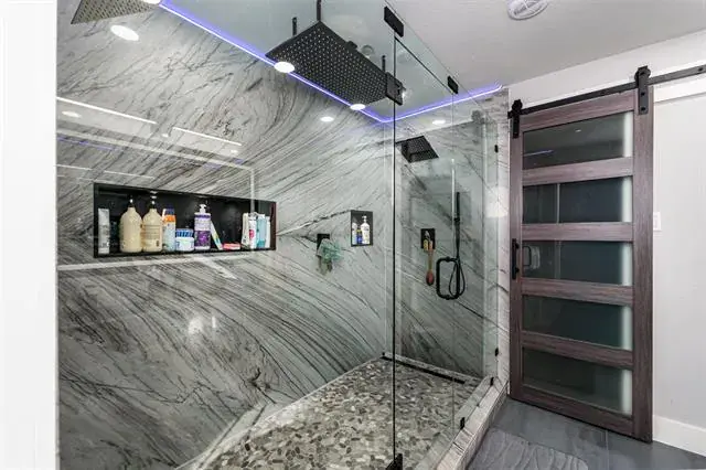 Upstairs, enjoy luxury vinyl plank flooring throughout. The expansive primary suite offers a serene retreat with a spa-like en suite bathroom featuring dual vanities with granite counters, a massive walk-in shower with granite tile walls, three shower heads, and a pebble stone floor. Two additional spacious bedrooms provide plenty of room for family or guests.