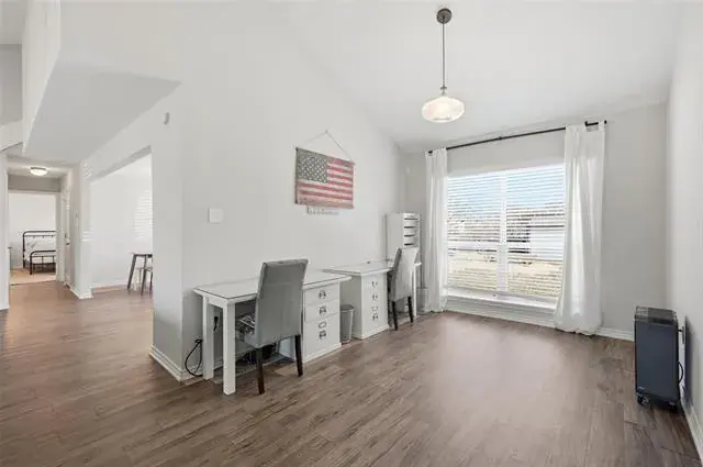 The primary suite is conveniently located downstairs, offering a private retreat, while spacious secondary bedrooms are upstairs. A versatile flex space on the main level can easily function as a formal dining room, home office, or playroom to suit your needs.