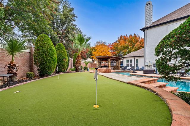 Built-in Barbecue, Covered Patio/Porch, Gas Grill, Rain Gutters, Lighting, Outdoor Grill, Outdoor Kitchen, Outdoor Living Center, Putting Green