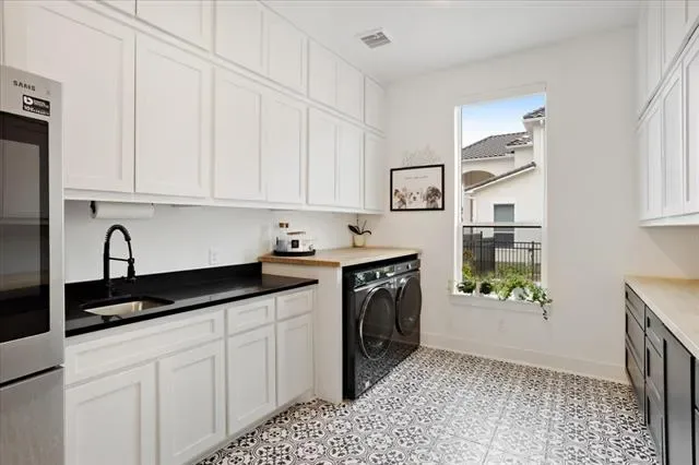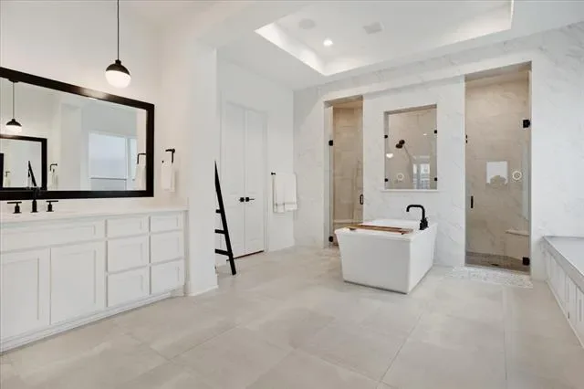 Upon entry, you are welcomed by a grand foyer highlighted by a dramatic double staircase, setting the tone for the upscale design carried throughout the home. At the heart of the residence lies a chef-inspired kitchen, beautifully appointed with an oversized waterfall island, abundant custom cabinetry, and generous prep space perfect for both everyday living and entertaining.