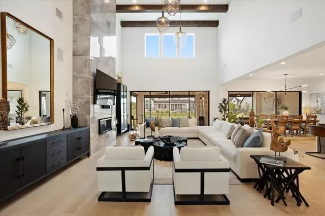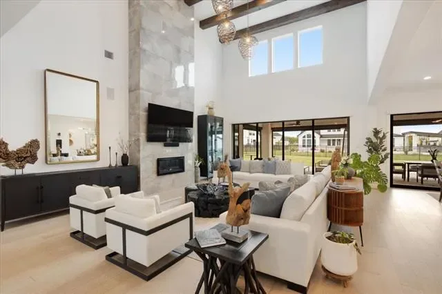 Thoughtfully curated details can be found throughout, including exposed cedar beams, designer lighting, electric shades, rich hardwood flooring, and an abundance of natural light. The inviting living area is anchored by a sleek linear gas fireplace, creating a warm yet refined atmosphere.