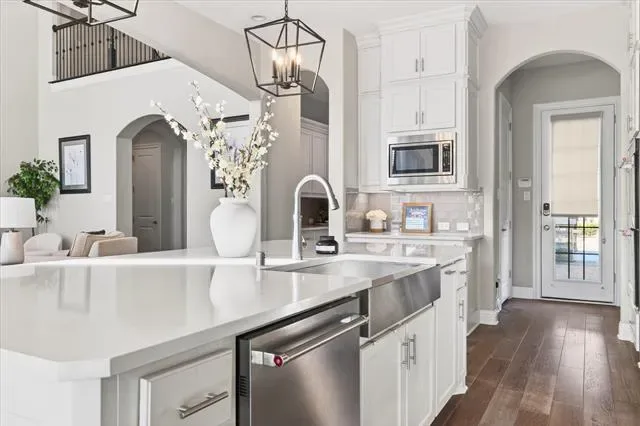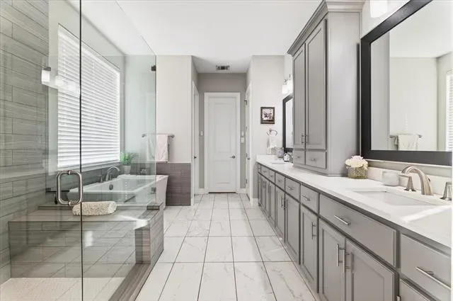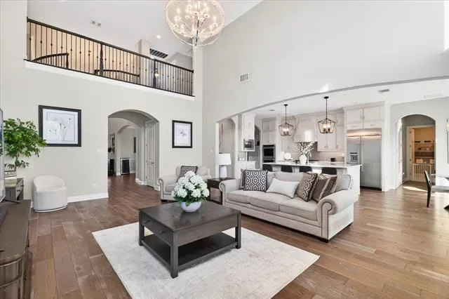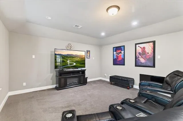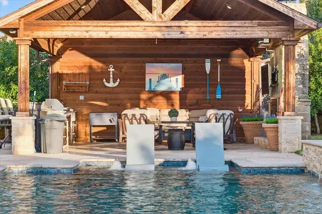 In a market where true differentiation is rare, this 2018-built residence in a quiet Flower Mound cul-de-sac stands apart. Designed for both daily livability and elevated entertaining, the home offers a level of backyard privacy and amenity that is seldom found under $2M. Beyond the gated porte-cochère, a private motor court introduces the four-car configuration, with the fourth bay currently styled as an entertaining lounge with bar — easily converted back to traditional garage use if desired. The main level balances openness with purpose. A private study sits behind French doors, while a full downstairs guest suite provides comfort for multigenerational living. The two-story great room creates scale and light without sacrificing warmth. The kitchen anchors the home with built-in refrigeration, gas cooking, generous cabinetry, and seamless access to the covered patio — a layout designed to function as beautifully as it presents. A dedicated full pool bath and oversized utility room reinforce the thoughtful planning throughout. Upstairs, three secondary bedrooms each feature private en-suite baths — a detail often reserved for significantly higher price points. A true media room and a separate game room with wet bar provide distinct gathering spaces, while the covered balcony extends living outward with neighborhood views. The backyard is where this property truly distinguishes itself. A diving pool that is BOTH heated AND chilled anchors the space, surrounded by mature landscaping that creates meaningful privacy. The cabana — complete with built-in grill and stone fireplace — allows for year-round outdoor living, while the hardscape accommodates both lounge seating and dining without sacrificing green space. This is not a home that requires future projects or added investment to feel complete. It has already been thoughtfully executed — offering scale, privacy, and versatility in one of Flower Mound’s most desirable settings. Search YouTube for video!