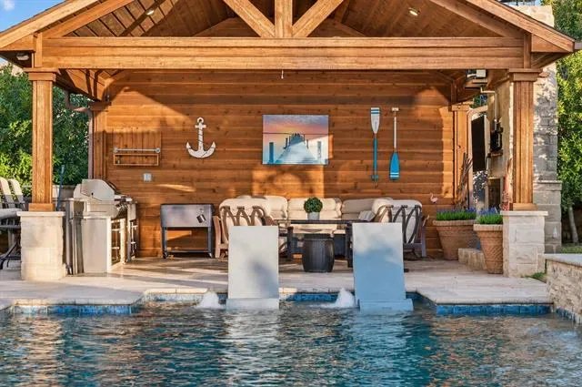 ***Be sure to watch the video of this incredible gorgeous property at www.4813Hughes.Com.*** In a market where true differentiation is rare, this 2018-built residence in a quiet Flower Mound cul-de-sac stands apart. Designed for both daily livability and elevated entertaining, the home offers a level of backyard privacy and amenity that is seldom found under $2M. Beyond the gated porte-cochère, a private motor court introduces the four-car configuration, with the fourth bay currently styled as an entertaining lounge with bar — easily converted back to traditional garage use if desired. The main level balances openness with purpose. A private study sits behind French doors, while a full downstairs guest suite provides comfort for multigenerational living. The two-story great room creates scale and light without sacrificing warmth. The kitchen anchors the home with built-in refrigeration, gas cooking, generous cabinetry, and seamless access to the covered patio — a layout designed to function as beautifully as it presents. A dedicated full pool bath and oversized utility room reinforce the thoughtful planning throughout. Upstairs, three secondary bedrooms each feature private en-suite baths — a detail often reserved for significantly higher price points. A true media room and a separate game room with wet bar provide distinct gathering spaces, while the covered balcony extends living outward with neighborhood views. The backyard is where this property truly distinguishes itself. A diving pool that is BOTH heated AND chilled anchors the space, surrounded by mature landscaping that creates meaningful privacy. The cabana — complete with built-in grill and stone fireplace — allows for year-round outdoor living, while the hardscape accommodates both lounge seating and dining without sacrificing green space.