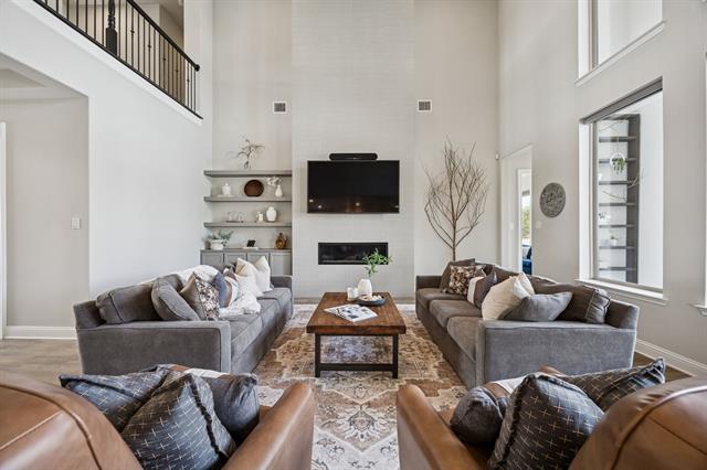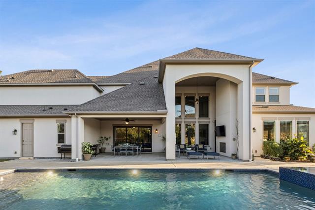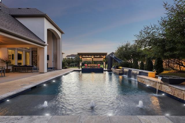 Welcome to a true destination multigenerational home in the desirable Townlake community in Flower Mound, situated on a premium lake-facing lot at a quiet cul-de-sac. Set on 0.8 acres, this property offers generous outdoor space for activities, pets, and entertaining. An inviting front porch leads to a grand foyer with dual staircases and a private office with french doors. The open floor plan blends traditional and contemporary elements, offering abundant natural light, clean lines, and sliding glass door for seamless indoor-outdoor living. The kitchen features an oversized island, premium built-in appliances, and a butler’s pantry. The spacious primary suite is a private retreat with spa-inspired bath, stand-alone soaking tub, walk-in shower, and his-and-hers closets.The private first-floor apartment features its own entrance, living area, and kitchenette—creating an ideal retreat for extended family, long-term guests, or live-in support while maintaining complete privacy from the main home. Upstairs offers three ensuite bedrooms with walk-in closets, a game room, stadium sitting media room, conditioned storage room, and a covered balcony overlooking the lake. The backyard is a resort-style escape with a custom Robertson’s salt water pool, infinity edge spa, water features, slide, covered patio with fireplace, pergola, and centennial native oaks. A porte-cochère leads to a private motor court and four-car garage. New roof. Conveniently located near award-winning schools and DFW Airport.
