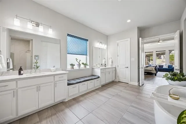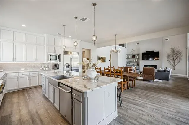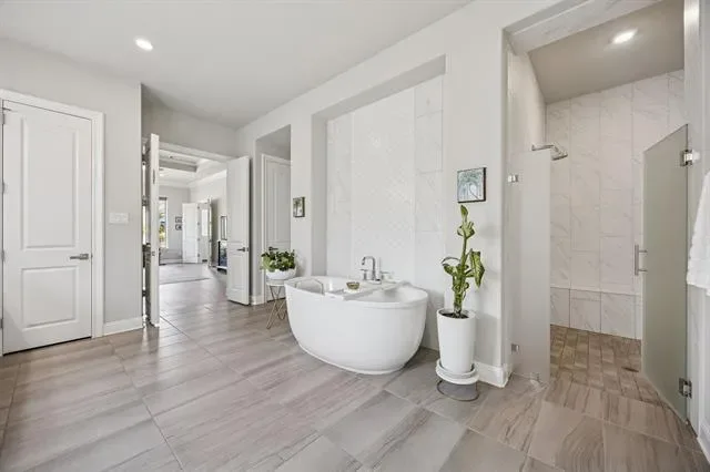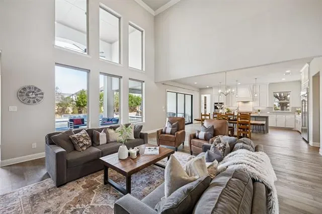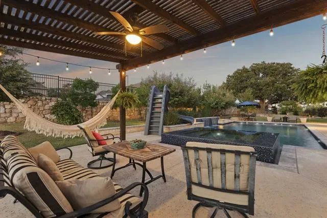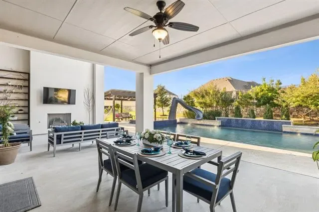 Welcome to a true destination multigenerational home in the desirable Townlake community in Flower Mound, situated on a premium lake-facing lot at a quiet cul-de-sac. Set on 0.8 acres, this property offers generous outdoor space for activities, pets, and entertaining. An inviting front porch leads to a grand foyer with dual staircases and a private office with french doors. The open floor plan blends traditional and contemporary elements, offering abundant natural light, clean lines, and sliding glass door for seamless indoor-outdoor living. The kitchen features an oversized island, premium built-in appliances, and a butler’s pantry. The spacious primary suite is a private retreat with spa-inspired bath, stand-alone soaking tub, walk-in shower, and his-and-hers closets.The private first-floor apartment features its own entrance, living area, and kitchenette—creating an ideal retreat for extended family, long-term guests, or live-in support while maintaining complete privacy from the main home. Upstairs offers three ensuite bedrooms with walk-in closets, a game room, stadium sitting media room, conditioned storage room, and a covered balcony overlooking the lake. The backyard is a resort-style escape with a custom Robertson’s salt water pool, infinity edge spa, water features, slide, covered patio with fireplace, pergola, and centennial native oaks. A porte-cochère leads to a private motor court and four-car garage. New roof. Conveniently located near award-winning schools and DFW Airport.