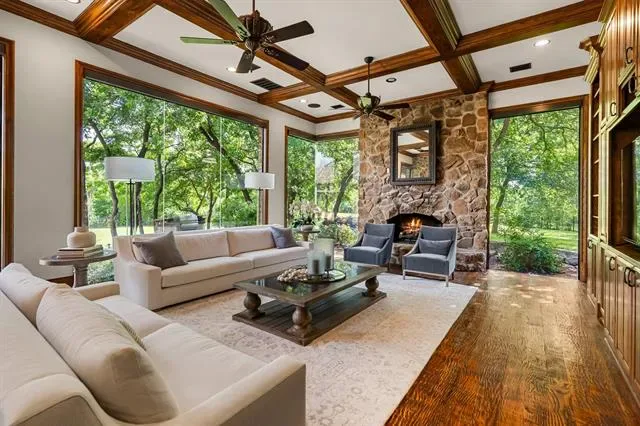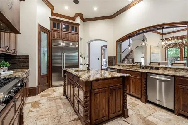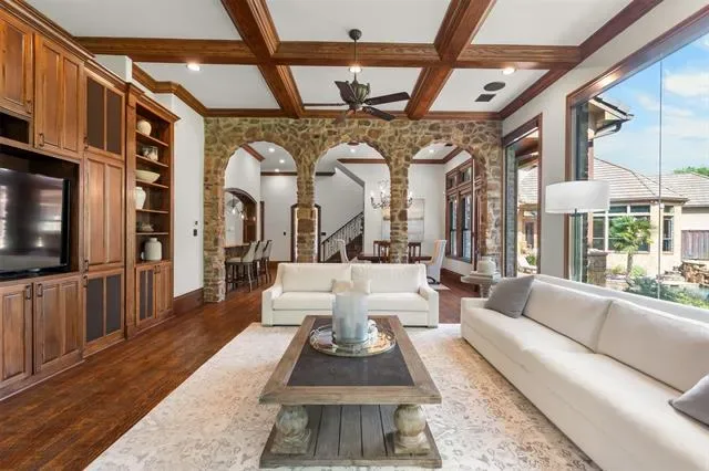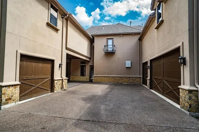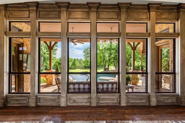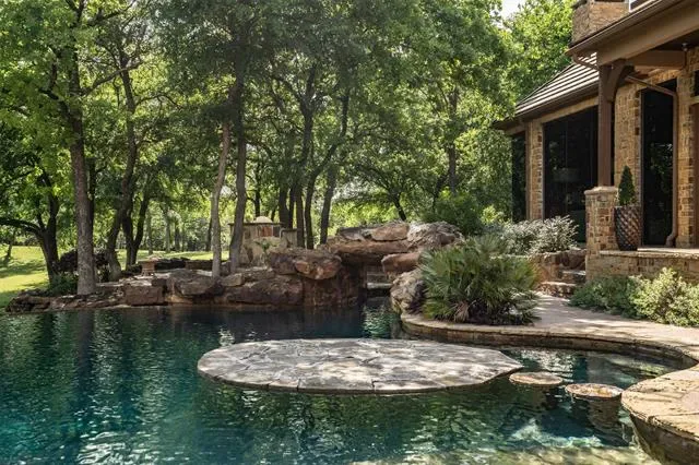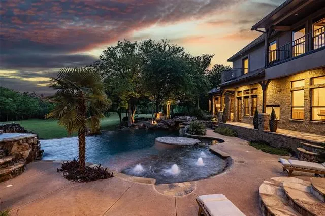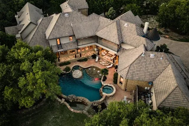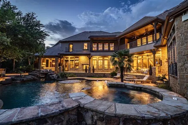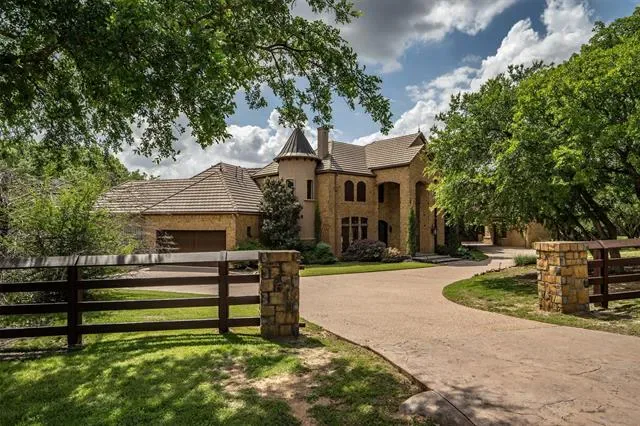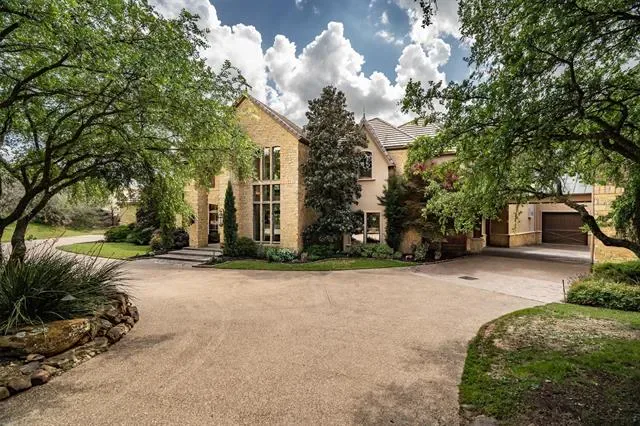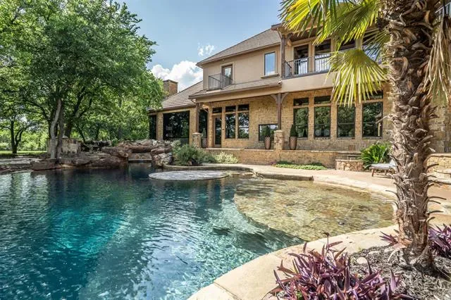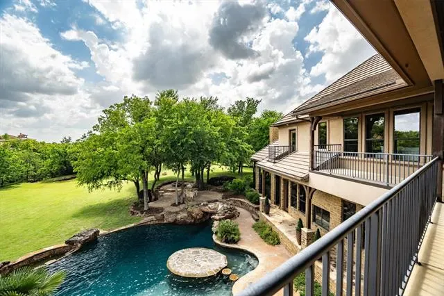 Tucked away on over 2 private acres, surrounded by multi-million-dollar estates, this 5-BR home w. no HOA beautifully blends luxury, comfort &' natural beauty, backing to Army Corps of Eng. land along Grapevine Lake for exceptional privacy &' serene views. Step thru the marble-tiled grand foyer w. soaring 2-story ceilings &' immediately take in the view of the breathtaking backyard oasis. Rich woodwork, elegant chandeliers &' 6 FPs create a warm yet sophisticated atmosphere thru-out this home. A car enthusiast’s dream: 4 garages (1 w. lift, 1 tandem) accommodate up to 8 vehicles. The private owner’s wing offers a primary suite w. tray ceiling, FP &' sitting area overlooking the grounds. The spa-inspired bath features dual vanities, oversized shower, flows into an enormous custom WI closet. Just outside are a dedicated office &' private garage access. In the opposite wing, a secondary suite w. sitting area, ensuite bath &' WI closet sits across from the formal dining. A wet bar adjacent to the breakfast rm opens to the outdoor living via a convenient pass-thru window. The chef’s kitchen is fully equipped w. BI fridge, dbl ovens, 6-burner gas cooktop, expansive island w. prep sink &' brkfst bar, all opening to a sunlit brkfst area. Triple stone arches lead to the living rm w. coffered ceiling, floor-to-ceiling stone FP, built-ins &' walls of windows. Upstairs, a private wing features an expansive media rm w. wet bar. Down the hall, a 2nd family rm w. coffered ceiling &' bar area opens to a balcony overlooking the pool &' tranquil grounds. 3 additional BRs, 2 w. corner FPs &' private balconies, feature ensuite baths &' WI closets. A massive game room w. FP &' wine bar is accessible via a staircase from the LR downstairs, while separate guest quarters include a living &' kitchen area, full bath &' private garage access. Outdoors, unwind in the resort-style backyard w. covered patio, sparkling pool w. spa &' grotto, a lush lawn framed by mature trees beyond. Your own private sanctuary!