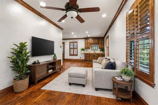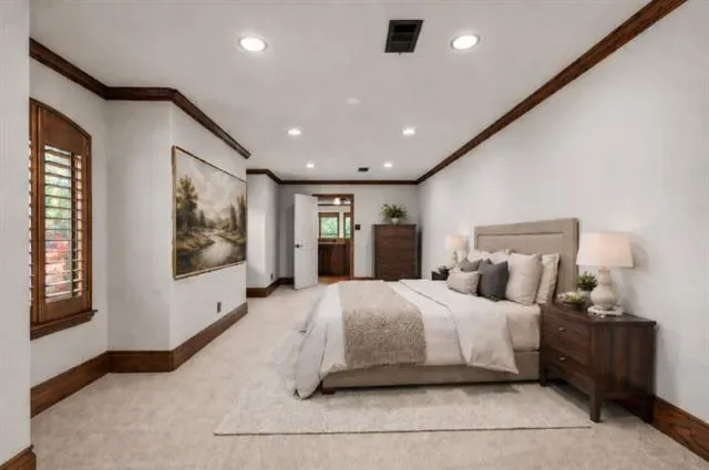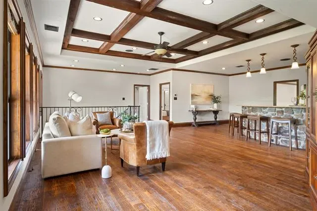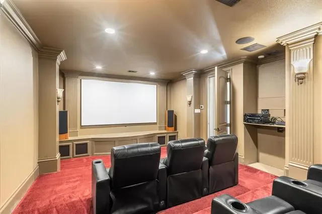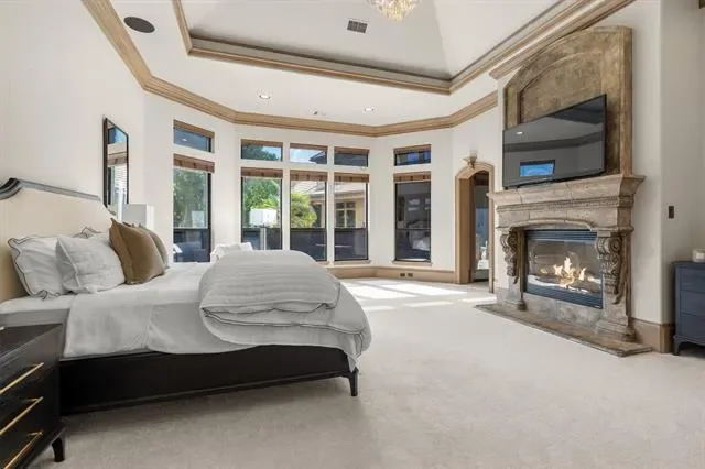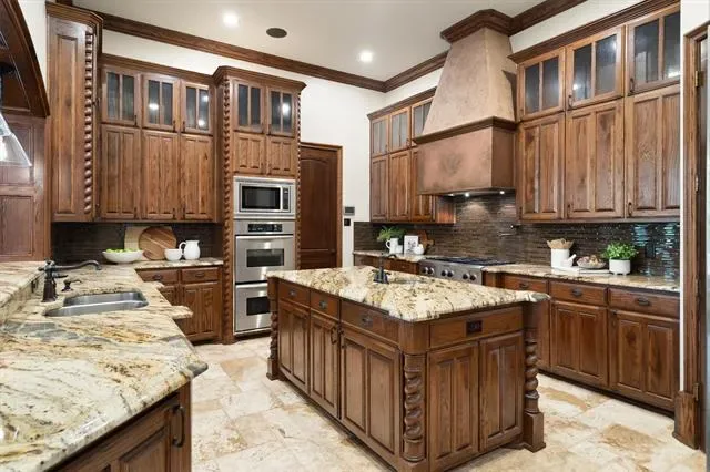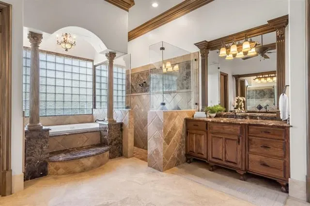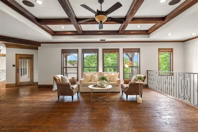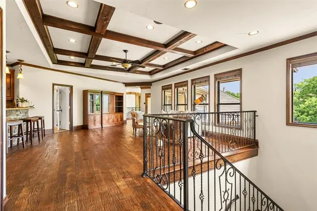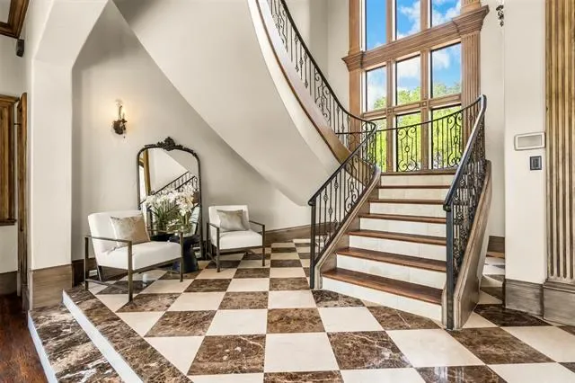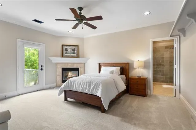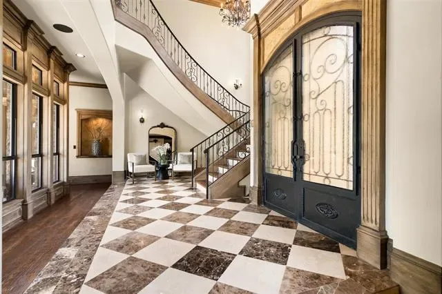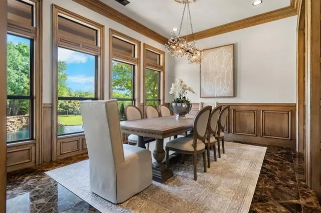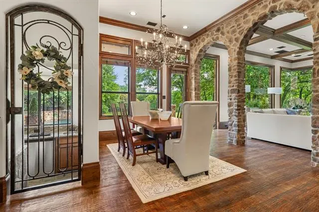 Tucked away on over 2 private acres, surrounded by multi-million-dollar estates, this 5-BR home w. no HOA beautifully blends luxury, comfort &' natural beauty, backing to Army Corps of Eng. land along Grapevine Lake for exceptional privacy &' serene views. Step thru the marble-tiled grand foyer w. soaring 2-story ceilings &' immediately take in the view of the breathtaking backyard oasis. Rich woodwork, elegant chandeliers &' 6 FPs create a warm yet sophisticated atmosphere thru-out this home. A car enthusiast’s dream: 4 garages (1 w. lift, 1 tandem) accommodate up to 8 vehicles. The private owner’s wing offers a primary suite w. tray ceiling, FP &' sitting area overlooking the grounds. The spa-inspired bath features dual vanities, oversized shower, flows into an enormous custom WI closet. Just outside are a dedicated office &' private garage access. In the opposite wing, a secondary suite w. sitting area, ensuite bath &' WI closet sits across from the formal dining. A wet bar adjacent to the breakfast rm opens to the outdoor living via a convenient pass-thru window. The chef’s kitchen is fully equipped w. BI fridge, dbl ovens, 6-burner gas cooktop, expansive island w. prep sink &' brkfst bar, all opening to a sunlit brkfst area. Triple stone arches lead to the living rm w. coffered ceiling, floor-to-ceiling stone FP, built-ins &' walls of windows. Upstairs, a private wing features an expansive media rm w. wet bar. Down the hall, a 2nd family rm w. coffered ceiling &' bar area opens to a balcony overlooking the pool &' tranquil grounds. 3 additional BRs, 2 w. corner FPs &' private balconies, feature ensuite baths &' WI closets. A massive game room w. FP &' wine bar is accessible via a staircase from the LR downstairs, while separate guest quarters include a living &' kitchen area, full bath &' private garage access. Outdoors, unwind in the resort-style backyard w. covered patio, sparkling pool w. spa &' grotto, a lush lawn framed by mature trees beyond. Your own private sanctuary!