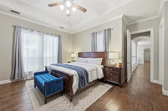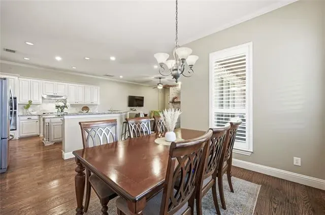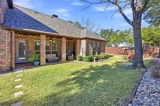 GORGEOUS 2-STORY loaded with HIGH-END FINISHES and a TANDEM 3-CAR GARAGE! Surround yourself in the luxury of this stunning home boasting extensive hand-scraped wood flooring, plantation shutters, wrought iron spindles, soaring ceilings, crown molding, an updated guest bathroom, LED lighting, a sun-filled skylight, fresh exterior paint, and a recently replaced roof. Make yourself at home in the cozy family room offering a floor-to-ceiling stone fireplace, or enjoy an easy, elevated cooking experience in the chef’s kitchen showcasing granite countertops, stainless steel appliances, a 5-burner gas cooktop, recently replaced dishwasher, coffee bar with a built-in wine rack, island, and a walk-in pantry. Tucked away at the back of the home, the secluded primary suite offers a tray ceiling, dual sink extended vanity, soaking tub, separate shower, and a huge walk-in closet with built-ins. The secondary bedroom downstairs offers versatility and can easily serve as a home office. Entertain family and friends in the massive media room featuring a snack bar area and surround-sound wiring. There’s ample storage throughout, including walk-in attic space and 2 large storage rooms with Elfa shelving. Nestled on a spacious corner lot in a quiet cul-de-sac, this property includes a private yard with a canopy of mature shade trees, a large covered patio with a ceiling fan, and plenty of room for outdoor fun. Close proximity to highly sought-after Flower Mound schools, with easy access to 2499 and DFW Airport. Take a first-person look at this gorgeous home! Click the Virtual Tour link to see the 3D Tour!