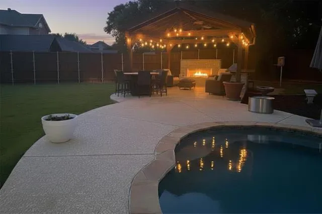 The outdoor centerpiece is a pool with tanning ledge, and a stunning 17×24 pergola-covered living area, fully equipped with an outdoor kitchen featuring a built-in gas grill, small refrigerator, granite countertop, and dual ceiling fans. Whether hosting summer cookouts or cozying up by the gas fireplace on a crisp evening, this space offers year-round enjoyment.