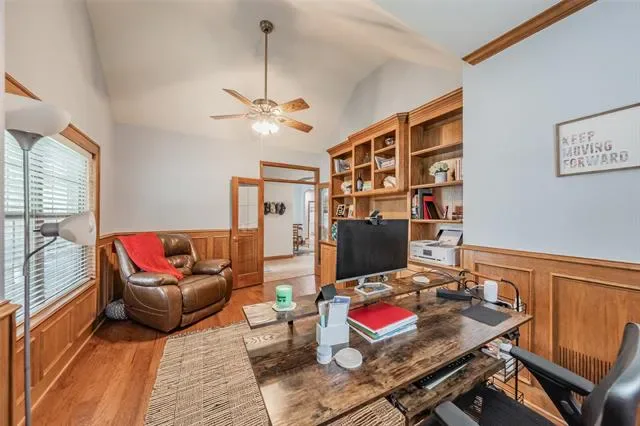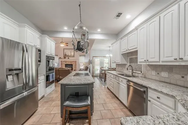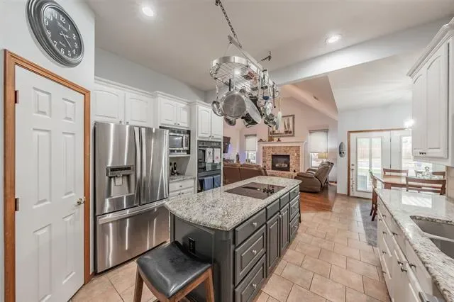 Inside, the home’s flow is equally impressive. The foyer leads to a dedicated study behind French doors, complete with a wall of custom built-in cabinetry. The heart of the home is a light-filled, open-concept living room with vaulted ceilings that transitions seamlessly into the chef’s kitchen. Culinary enthusiasts will appreciate the granite countertops, center cooking island, double ovens, walk-in pantry, and a charming eat-in breakfast area, complemented by a formal dining room.