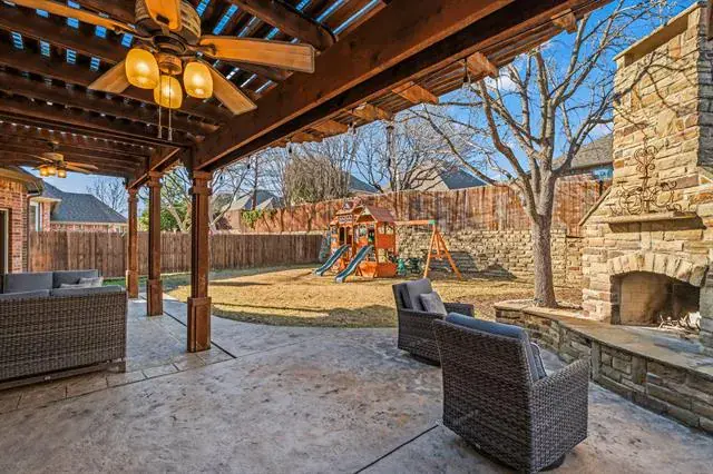Amazingly spacious and beautifully designed home built by Highland Homes in Wellington, this 5-bedroom, 4-bath home offers the perfect blend of comfort, functionality, and lifestyle and room for everyone. The open-concept living area features a stunning stone fireplace that serves as the focal point of the living room, creating a warm and inviting atmosphere. The thoughtfully designed floor plan includes a dedicated office—ideal for working from home—a main floor primary suite, as well as a spacious game room perfect for entertaining, movie nights, or a play area plus 4 additional bedrooms upstairs. Nice sized kitchen with eat in breakfast nook combines rich wood cabinetry with stone countertops for easy maintenance. With five generously sized bedrooms and 3 full bathrooms with downstairs half bath, there’s plenty of room for family and guests alike. The extra deep garage can handle your Texas-sized truck or room for all of your recreational toys. Step outside to your own backyard retreat featuring an outdoor fireplace—perfect for cozy evenings and year-round entertaining plus there''s still room for a pool. Enjoy being just a short stroll from the community pool and playground, and within walking or biking distance to a top-rated elementary school, making everyday living both convenient and connected. This home truly offers space, comfort, and an unbeatable location all in one!