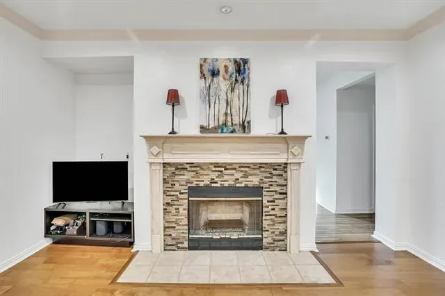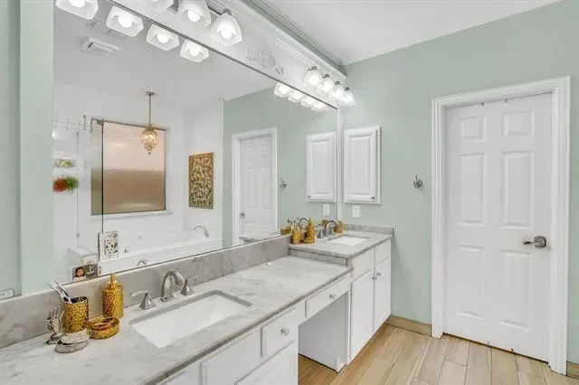 The primary suite overlooks the backyard and includes a cozy sitting area, along with a large en-suite bathroom featuring dual sinks and generous closet space.