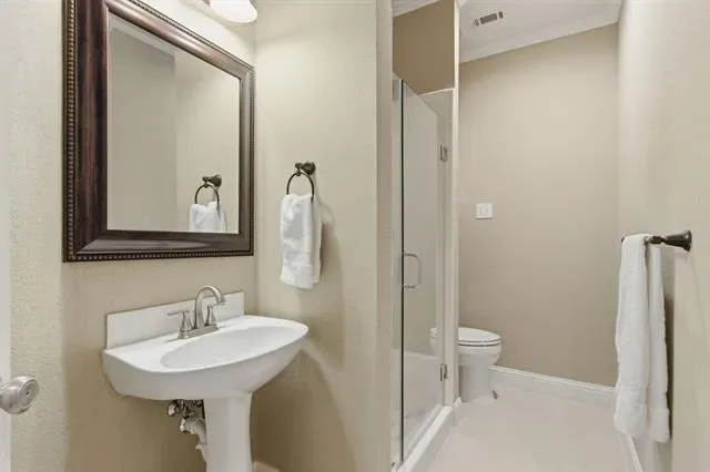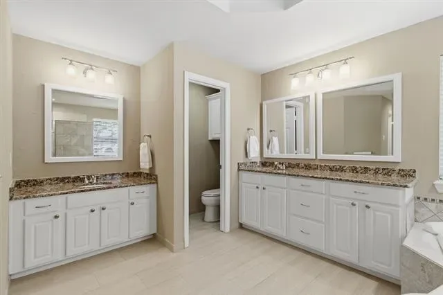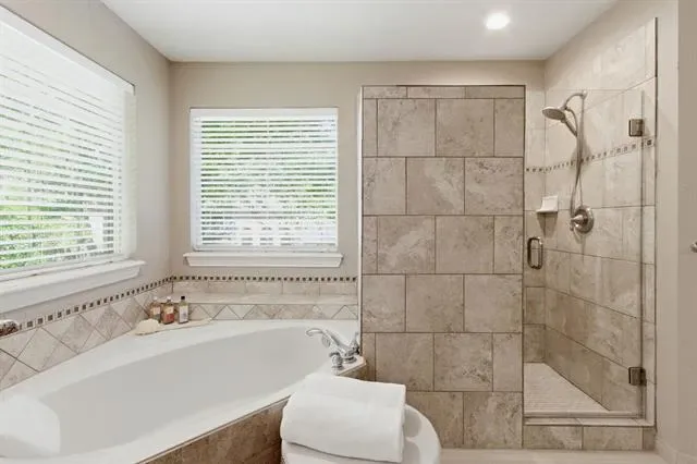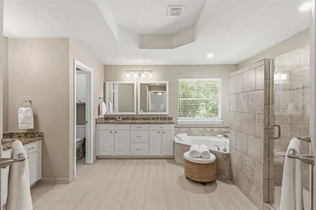 The oversized primary suite offers a private retreat with a spa-inspired bathroom, including a large walk-in shower and separate soaking tub.