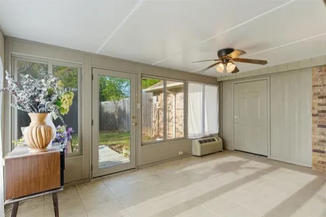 The kitchen includes ample cabinet storage, generous counter space, and a breakfast area overlooking the backyard. Adjacent to the kitchen is a 160 sq ft enclosed sunroom (not included in the DCAD square footage) equipped with its own wall AC and heater, creating a comfortable year-round space perfect for a second living area, workspace, or hobby room.