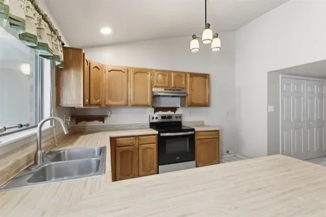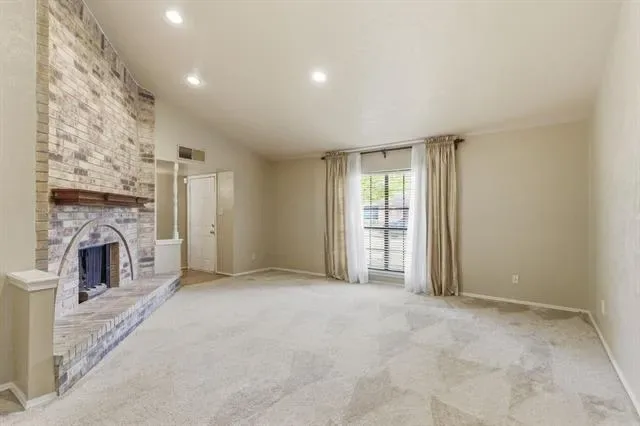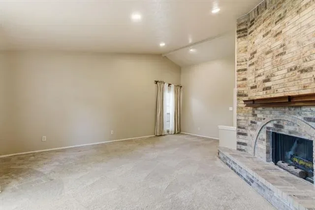 The spacious main living area features vaulted ceilings, a brick wood-burning fireplace, and abundant natural light. A secondary living and dining area provides additional flexibility for a formal space, home office, or playroom.