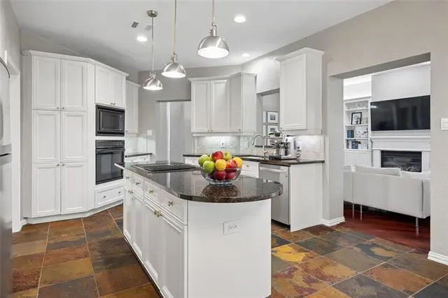 The beautifully appointed kitchen offers granite countertops, crisp white cabinetry and generous prep space—perfect for everyday living and entertaining alike.
