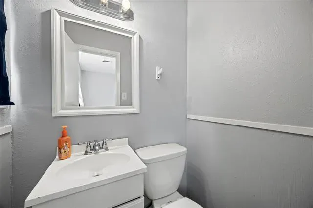 The primary bedroom offers an abundance of natural light, a private half bath, and a generously sized closet. Two additional bedrooms provide flexibility for family, guests, or a home office. The refreshed hallway bath includes a tiled shower-tub combo and a modern white vanity.