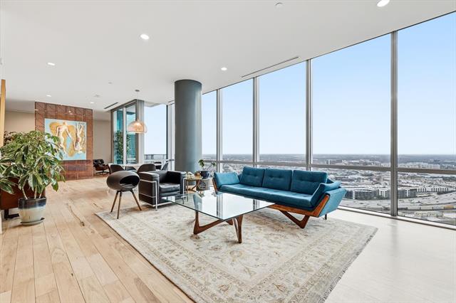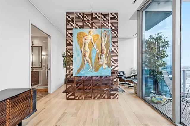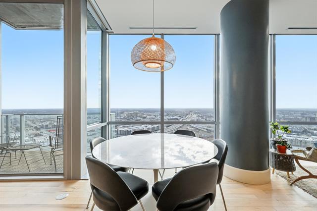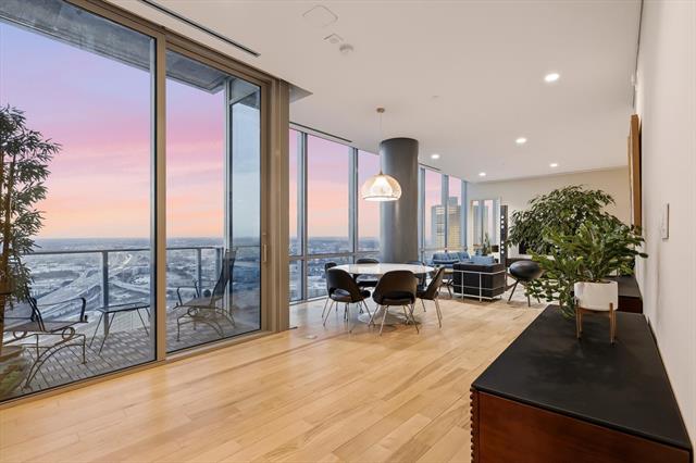 Privacy and elevated luxury await in this 27th-floor residence at The Omni Residences in downtown Fort Worth. Floor-to-ceiling walls of glass frame panoramic skyline views and open to a private balcony overlooking the city. This contemporary home features hardwood floors, formal dining, and an open-concept living and kitchen design ideal for entertaining. The kitchen offers granite countertops, a gas cooktop, built-in stainless-steel refrigerator (less than three years old), stainless appliances, and generous cabinetry. Motorized solar and blackout shades are installed on all windows with remote and smartphone control. The living room and office include remote-controlled dimming switches, and the entry door provides proximity-based keyless access. Fiber-optic internet is hardwired to the router panel. The primary suite includes an expansive walk-in closet and a spa-style bath with dual vanities, soaking tub, and separate glass-enclosed shower. The secondary bedroom features an en-suite bath and functions well as a guest suite, office, or flex space. Residents of The Omni Residences enjoy 24-hour concierge service, secured entry, and gated parking. Unit comes with two designated spaces on Level P1. Ownership includes access to the private residents-only pool, hot tub, grilling areas, cabanas, fitness center, terrace, and Zen garden. Through the Omni Hotel connection, residents receive discounted hotel room reservations, in-condo dining aka room service discounts, preferred access and discounts at Mokara Spa, and hotel pool plus fitness center. The Omni Hotel has six on-site dining options, including Bob’s Steak &' Chop House and a Starbucks Coffee. Located in the historic Hells Half Acre in downtown Fort Worth near dining, entertainment, and cultural venues. Walking distance to the Fort Worth Convention Center, Sundance Square, Bass Hall, New Texas A&'M Campus, and so much more.