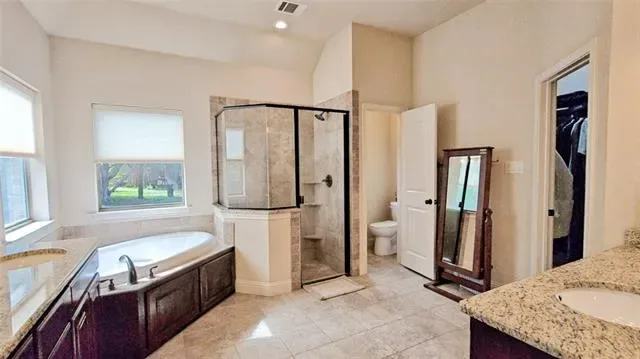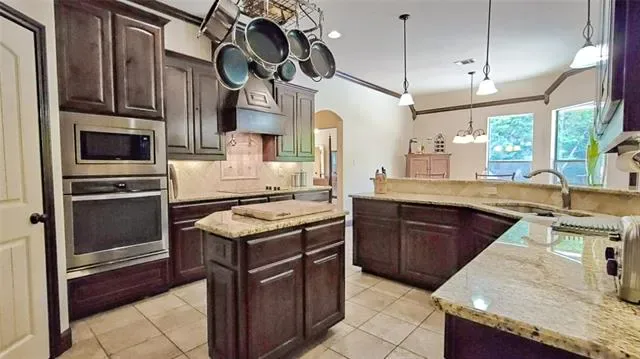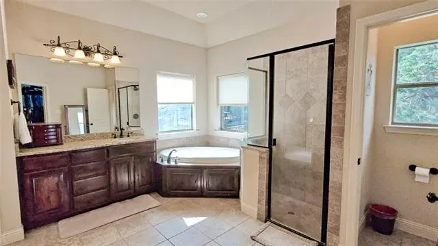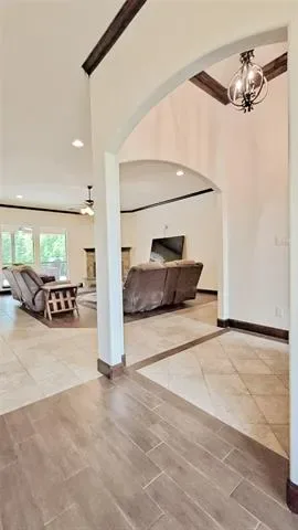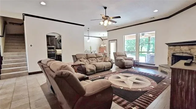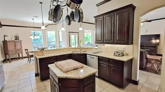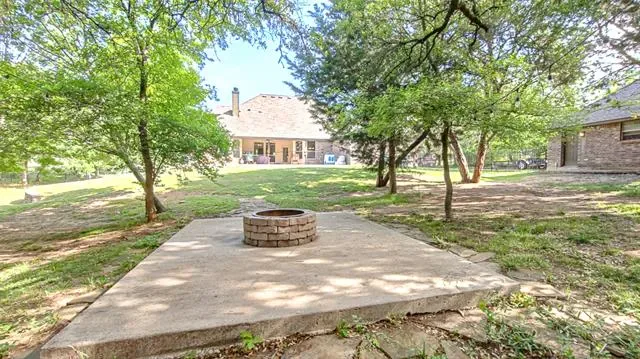 Custom home on a hard-to-find 1-acre lot with a 4-bedroom, 3.5-bath layout &' 5-car garage setup in sought-after Arbor Mill Plantation, zoned to Azle ISD. With 3,525 SF, the layout is highly functional — primary suite &' three bedrooms down, plus a game room &' dedicated media room upstairs — both connected to a full bath, offering flexibility for a 5th bedroom if desired. The kitchen is the centerpiece of the home, featuring an island with granite countertops, abundant cabinetry, tile backsplash, oven &' built-in microwave, stainless appliances, &' a breakfast bar that opens directly to the living area. The family room offers a brick wood-burning fireplace, tall ceilings, &' arched openings that add character while keeping the space open. The primary suite is spacious with separate vanities, garden tub, walk-in shower, &' walk-in closet. Tile flooring throughout the main living areas. Outside, the property really opens up — &' you will LOVE this view. The covered patio (16×10) with ceiling fan extends to an expansive stamped &' stained concrete patio (44×16) — perfect for entertaining — with mature trees, stone retaining wall, &' a built-in stone fire pit. The detached 2-car garage is ideal for a workshop, storage, or hobbies, in addition to the 3-car side-entry garage. Well &' septic (typical for the area), plus water softening system. You will LOVE this home — come see it!