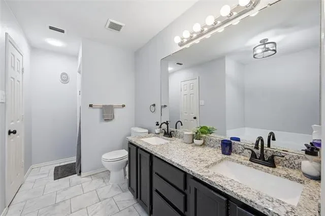 Pride of ownership shows in this beautifully updated, 2-story home that boasts an open floor plan with high vaulted ceilings. Master bedroom conveniently located on the lower level, features an en-suite bath with dual sinks, marble flooring, a jetted garden tub with a separate shower and a walk-in closet. Tasteful updates include granite counters, stylish backsplash, new paint inside and out, new carpet and flooring throughout and updated master and secondary bathrooms. Backyard oasis has an extended covered patio, the perfect spot for a firepit and plenty of room for entertaining. Major highways, downtown Fort Worth, AT&T Stadium and shopping are easily accessible just minutes from this home.