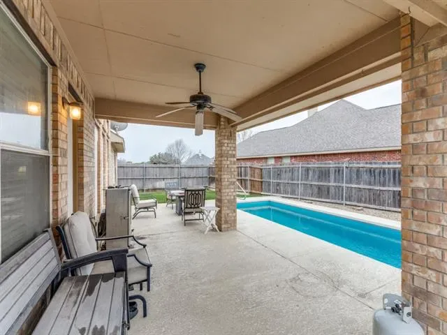 Enjoy Texas outdoor living with a covered patio overlooking your private pool, creating the ideal space for relaxing or hosting friends and family.