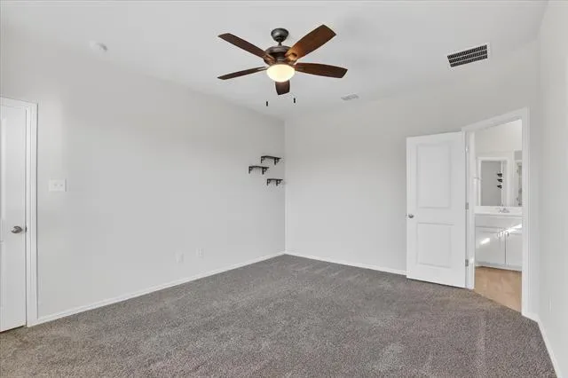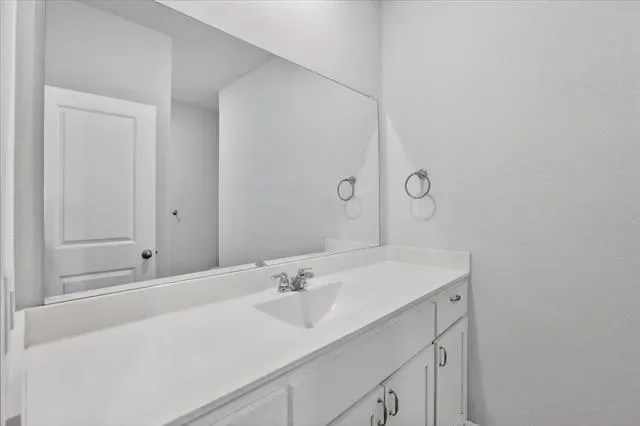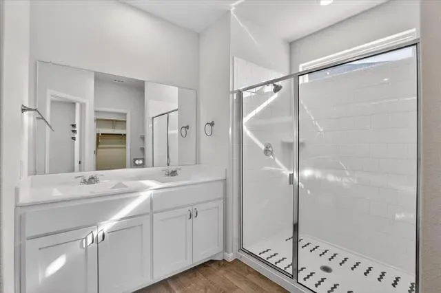 The split-bedroom arrangement provides privacy for the primary suite, which includes a dual-sink vanity, oversized walk-in shower, and a spacious walk-in closet. Both bathrooms feature cultured marble vanities, with tile flooring throughout the entry, hallways, and wet areas. The home also includes smart home technology.