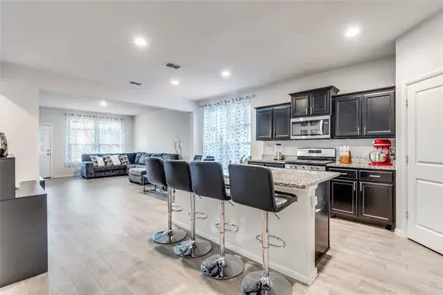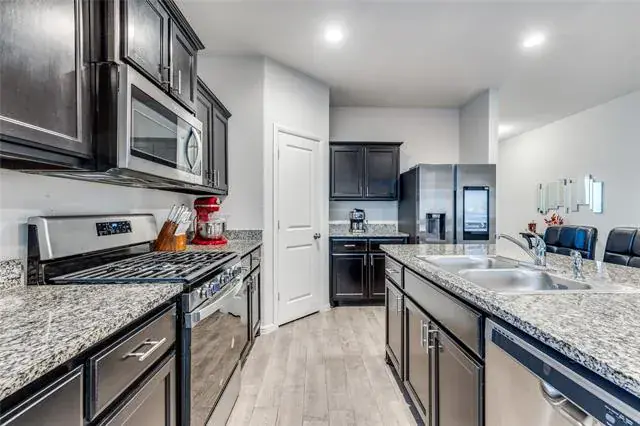There’s something about this home that feels effortless from the moment you walk in. Bright, open spaces connect naturally, creating a layout that’s both comfortable and inviting. The kitchen anchors the home and opens seamlessly to the main living and dining areas. It features granite countertops, stainless steel appliances, a gas cooktop, and a large island with generous seating. As an added bonus, the Samsung smart refrigerator conveys with the home, making this space truly move-in ready. The primary bedroom is spacious and privately set, offering a calm retreat with an ensuite bath that includes dual sinks, a walk-in shower, and ample storage. Secondary rooms are well-sized and flexible, and the additional flex space gives you options:home office, workout space, creative studio, or whatever fits your lifestyle. Out back, the covered patio and expansive fenced yard create an easy outdoor extension of the home, ideal for relaxing, hosting, or planning future upgrades. A dedicated laundry room with built-in shelving and a spacious garage add even more practicality. This home has an ASSUMABLE LOAN at 4.125% interest.
