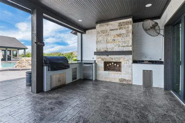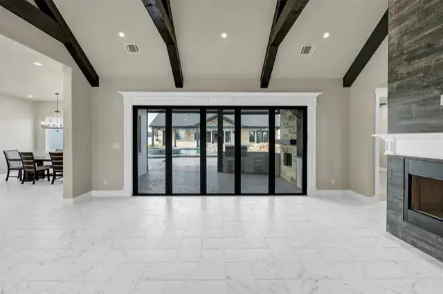 The outdoor living experience rivals that of a private resort, featuring an oversized custom swimming pool, a fully equipped outdoor kitchen, and electric patio shades—ideal for year-round enjoyment. Accordion-style sliding glass doors in the living room create a seamless indoor-outdoor flow, maximizing both natural light and entertaining space.