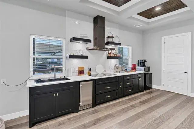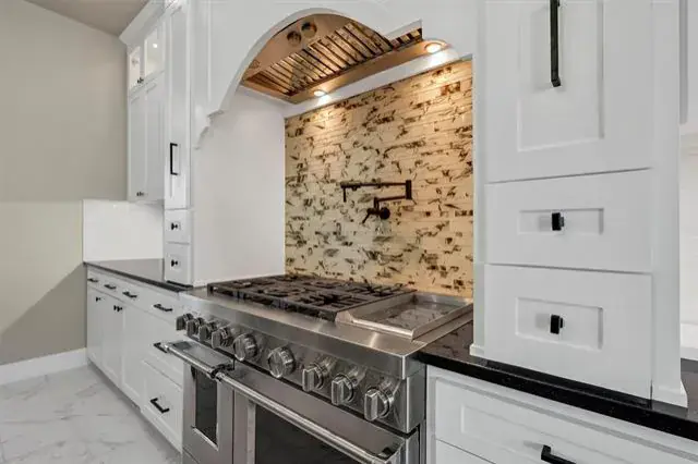 Inside, porcelain tile flooring runs throughout the main residence, complemented by high-end finishes and intentional design. The primary suite offers a true spa-like retreat with an electric fireplace, oversized walk-in shower, and a luxurious freestanding soaking tub. The chef’s kitchen is outfitted with premium KitchenAid appliances, providing both style and functionality for everyday living and hosting.