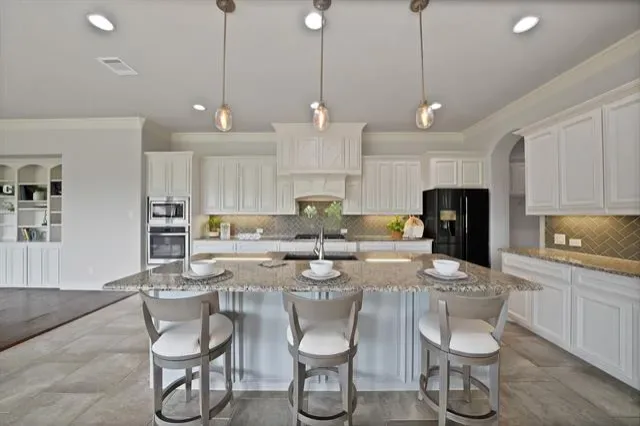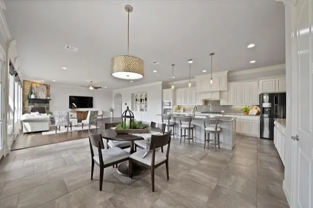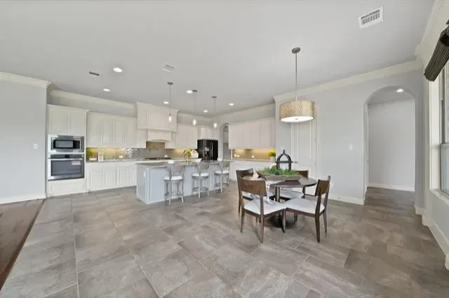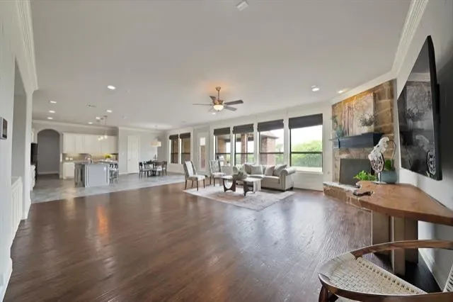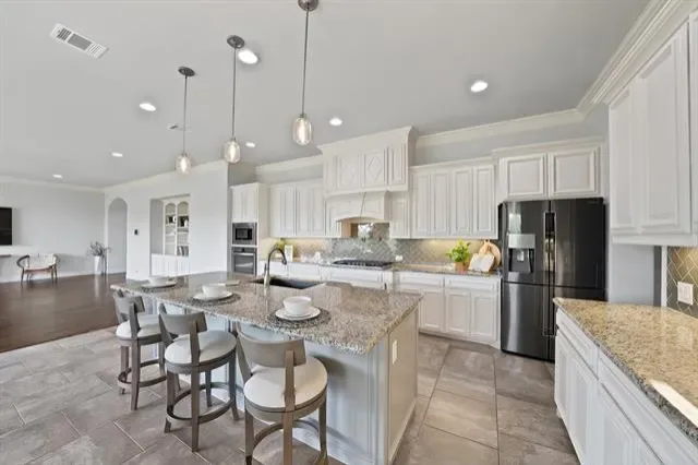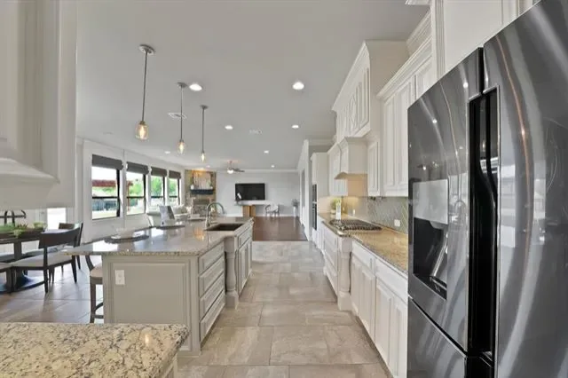 Priced to sell! This beautifully maintained home sits on 1.36 acres within the prestigious, gated, and guarded Bella Flora community. This home is over 4000 sqare feet, all on one level. Filled with natural light, the expansive open-concept layout creates a warm and inviting atmosphere. The kitchen features a spacious eat-in island, farmhouse sink, striking herringbone tile backsplash, stainless steel appliances, and a dining area perfect for gatherings. Custom ceiling details and hand-scraped wood flooring add exceptional character throughout the home.