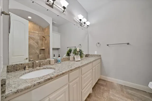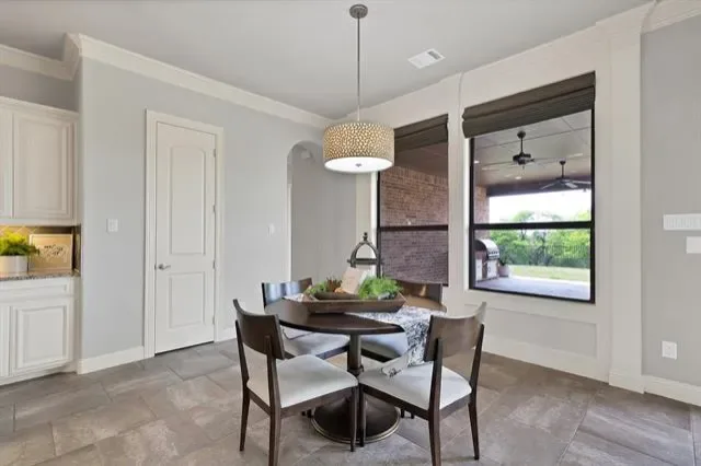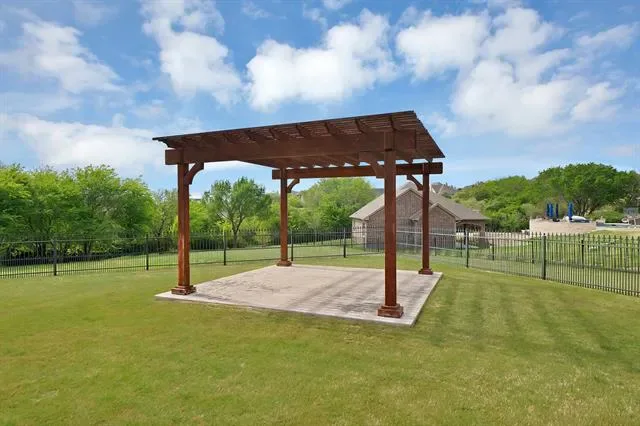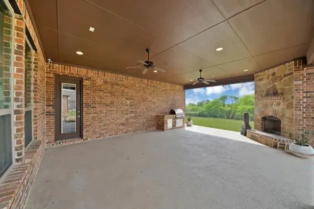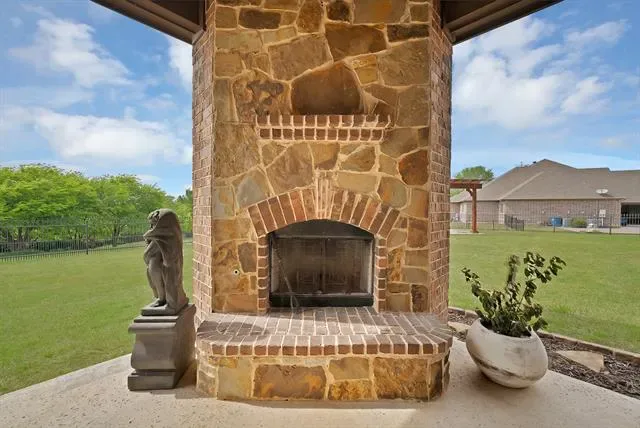 The luxurious primary suite is thoughtfully separated from the guest bedrooms and bathrooms, offering a private retreat. The dedicated office is truly a standout space. Outdoors, enjoy year-round entertaining under the large covered patio complete with a built-in grill and fireplace, while the pergola provides even more space to relax and host. The property backs to a serene greenbelt, enhancing both privacy and views.