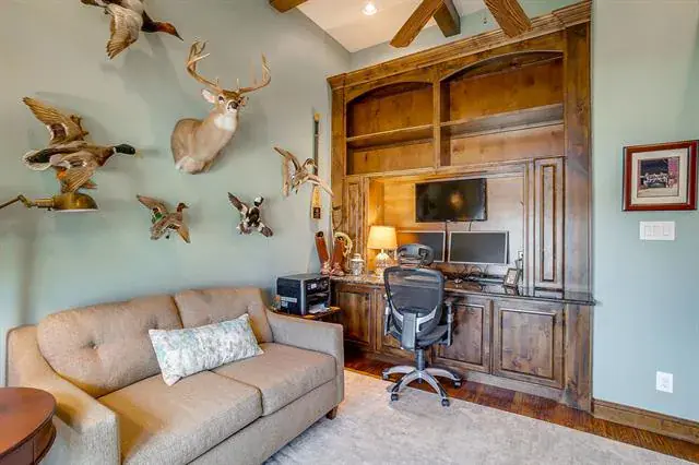 Inside, the home offers an open-concept layout with rich hardwood floors, a spacious living area anchored by a stone fireplace, and a chef’s kitchen with granite countertops, custom cabinetry, and oversized island. Natural light fills the home, creating a warm and inviting atmosphere throughout.