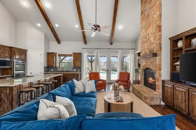 Natural light fills the interior, highlighting the formal dining space and open-concept living area, anchored by a vaulted wood-beamed ceiling, floor-to-ceiling stone fireplace, custom built-ins, and hardwood floors. The chef’s kitchen features top-of-the-line appliances, generous prep space, and seamless flow for both everyday living and entertaining.