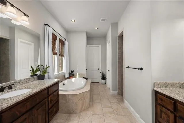 The primary suite is tucked away for added privacy and offers a peaceful retreat with fireplace, spa-inspired bath featuring soaking tub, walk-in shower, dual vanities, and separate walk-in closets.