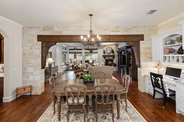 Outdoors, the expansive backyard offers exceptional space for recreation &' relaxation, while the covered patio creates a true outdoor living retreat with built-in grill, comfortable seating area &' gas fireplace—perfect for entertaining &' enjoying peaceful Texas evenings. See documents for many more upgrades!