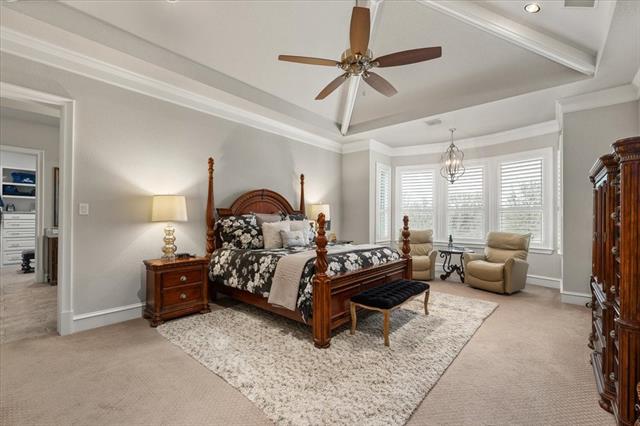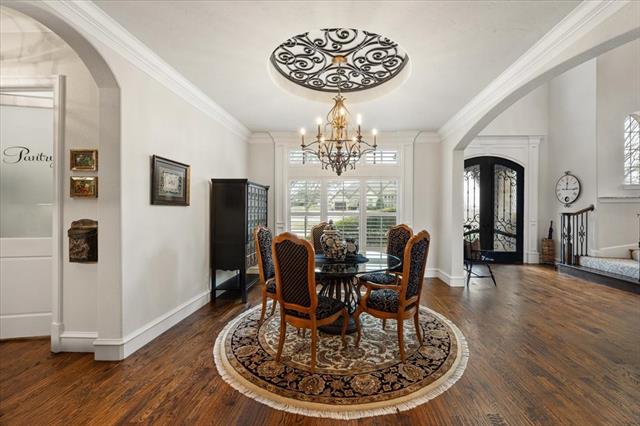 The main level showcases an expansive 1st-floor primary suite retreat featuring a spa-inspired bath with separate soaking tub, walk-in shower &' a customized oversized walk-in closet designed for exceptional organization. An executive office includes a fully concealed tornado-safe room complete with large safe, seamlessly integrated for both security &' discretion. Formal living &' dining rooms provide elegant spaces for gatherings &' entertaining with soaring ceilings &' elegant wood accents.