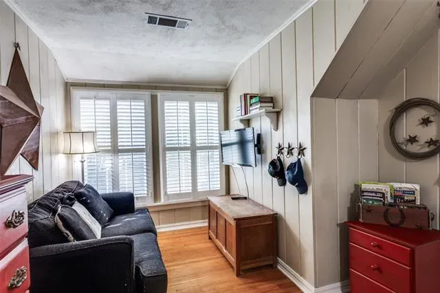 Tucked into the beloved Bellaire Addition neighborhood and just a short walk from Texas Christian University, this charming 1940s home is the kind of place that immediately feels warm, welcoming, and full of character. From the moment you arrive, the beautiful mature oak tree and classic curb appeal set the tone for what’s inside. Step through the door and you’ll find original hardwood floors, timeless built-ins, and rooms filled with natural light that highlight the home’s historic charm. The living room centers around a cozy gas fireplace—perfect for quiet evenings or gathering with friends. Just beyond, the dining room shines with a stunning chandelier that adds a touch of elegance while still feeling relaxed and inviting. The spacious eat-in kitchen blends vintage character with modern function, featuring granite countertops, 42-inch cabinets, and eye-catching wood plank ceilings and wall paneling. It’s a space designed for real life—morning coffee, family dinners, and lingering conversations around the table. Three oversized bedrooms offer flexibility and comfort, each with enough space for a sitting area. One bedroom is located downstairs, while two are upstairs, creating options for guests, family, or a private retreat. Two cedar closets provide wonderful storage for special items. Upstairs you’ll also find a built-in desk and shelving area—perfect for a home office, craft room, or study space. Beyond the third bedroom is a bonus room with endless possibilities: a fourth bedroom, playroom, dressing room, or generous storage area. One of the home’s most special spaces is the screened-in back porch—an ideal spot to relax and unwind while overlooking the expansive backyard with lush St. Augustine grass. Whether you’re entertaining, gardening, or simply enjoying a quiet evening outdoors, the backyard offers room to truly spread out. Full of history, charm, and thoughtful spaces, this lovingly maintained home offers a rare opportunity.