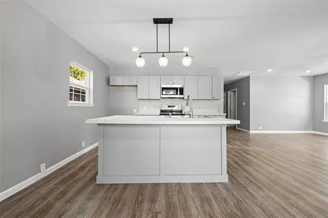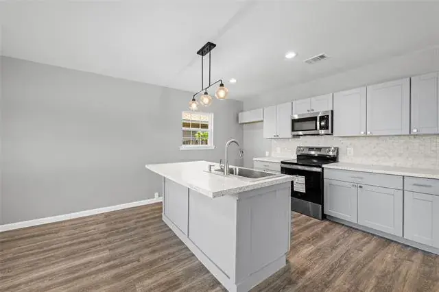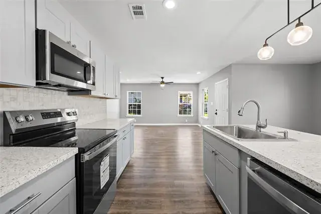 DOWN PAYMENT ASSISTANCE AVAILABLE! Step into this beautifully designed 3-bedroom, 2-bathroom traditional modern home that effortlessly blends style and functionality. The open-concept layout creates a bright and welcoming space, highlighted by sleek black finishes, laminate wood flooring, a designer tile backsplash, and a refined gray-and-white color palette. The kitchen features an island with farmhouse sink, and stainless-steel appliances, perfect for cooking and entertaining. Enjoy generously sized bedrooms and a spacious master suite complete with a walk-in closet and a spa-inspired bathroom with dual sinks and his-and-her vanities. Don’t miss this incredible opportunity to make it yours!