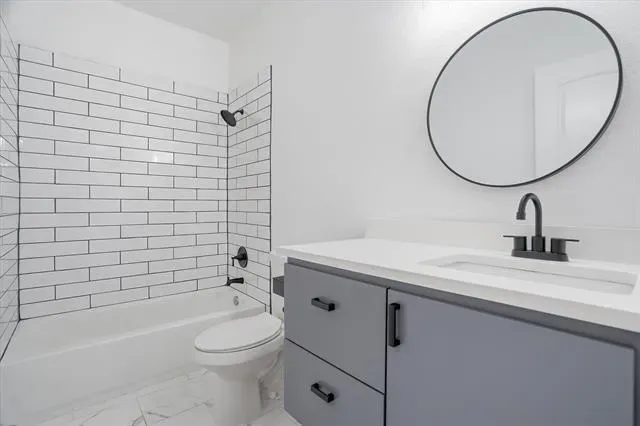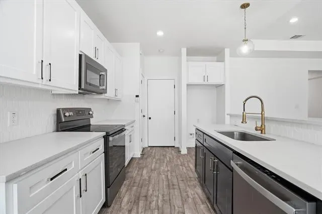 The interior showcases ceramic wood-look tile flooring throughout the main living areas, creating a seamless and stylish flow. The kitchen serves as the heart of the home, complete with quartz countertops, white and dark shaker cabinetry, a center island, and sleek black and stainless steel appliances—perfect for cooking for family and guests.