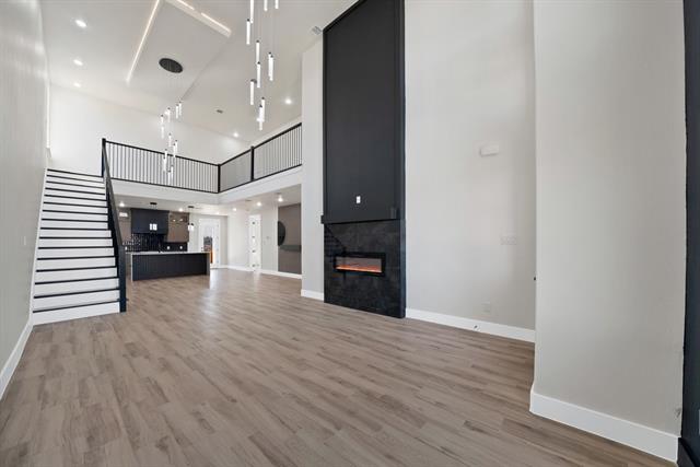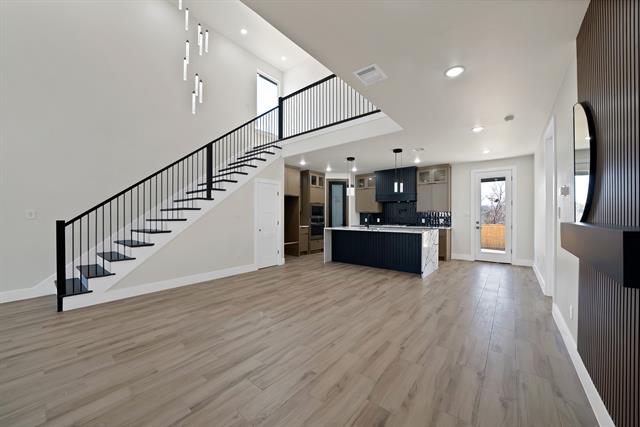 Experience refined modern living in this stunning three bedroom, two and a half bath residence offering 2,056 square feet of thoughtfully designed space just minutes from downtown Fort Worth and the stockyards. Soaring 20 foot ceilings create an impressive sense of scale and light, perfectly complemented by elegant chandeliers and designer ceiling lighting throughout. The heart of the home features a chef’s kitchen with a statement island, custom cabinetry, and sleek finishes ideal for both entertaining and everyday living. The tile flooring throughout delivers a clean, contemporary aesthetic and effortless maintenance. A spacious dining area with a stylish dry bar adds an elevated touch for hosting guests. Retreat to the primary suite, complete with custom closet shelving and a spa-inspired feel. Additional highlights include a 2-car garage, beautiful stamped driveway and exceptional curb appeal showcased by a modern, sophisticated exterior design. This home seamlessly blends luxury, functions, and location-offering modern elegance with close proximity to Fort Worth’s most iconic destinations.