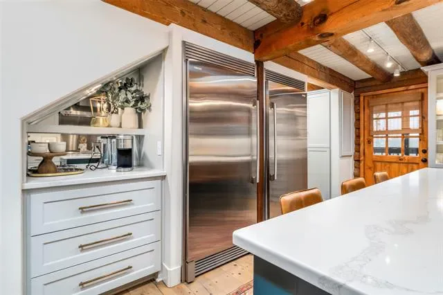 Notice the fabulous light fixture above the staircase as you enter the home. The gourmet chef’s kitchen features a built-in refrigerator and freezer and luxury high-end Monogram GE appliances along with a six burner gas stove. The original pine wood floors have been beautifully refinished to preserve the home’s rustic charm. A gorgeous stone fireplace anchors the family room, creating the perfect space to relax on cool mornings or cozy evenings. Thoughtful renovations maximize storage throughout the home, utilizing every inch of space. There are 2 Generac generations installed in the home so you never lose electricity along with a tankless hot water heater.