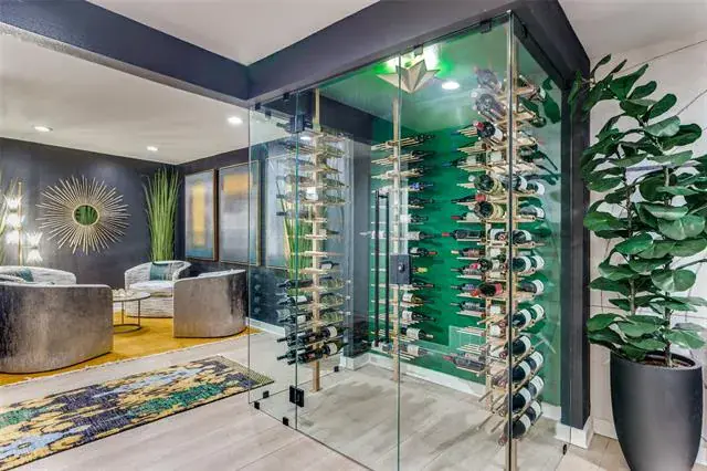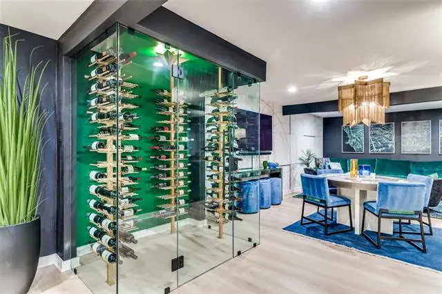 One of the home’s most distinctive features is the speakeasy-inspired basement, complete with a custom wine bar—an atmospheric hideaway tailor-made for memorable evenings.