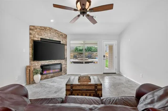 Interior features include upgraded tile flooring throughout the main areas and laminate wood flooring in the bedrooms-no carpet. A decorative, remote controlled fireplace with a stone-accented wall adds a modern warmth and character to the main living space.