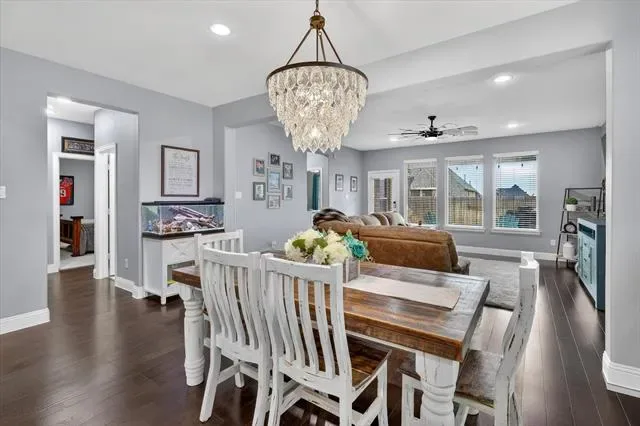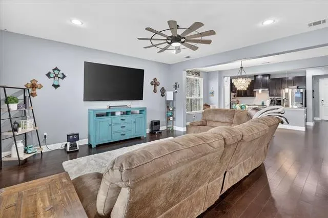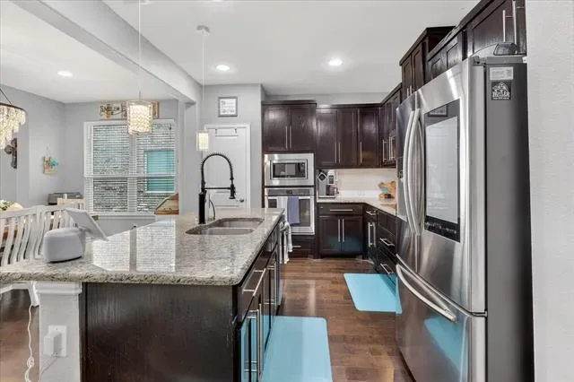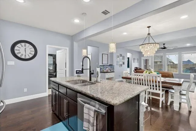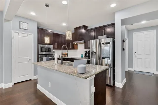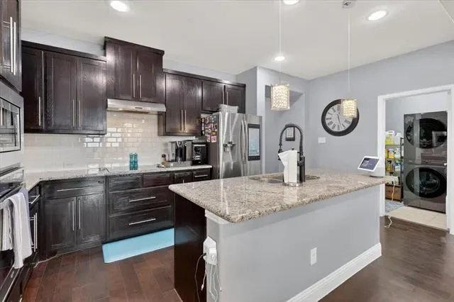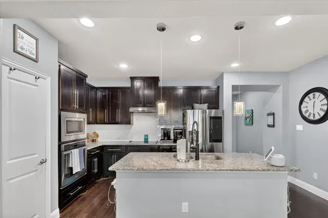 Step inside to discover a bright, open-concept floor plan featuring rich dark wood floors and a spacious living area perfect for relaxing or entertaining. The modern kitchen is a chef’s delight, seamlessly flowing into the living space. It showcases beautiful granite countertops, elegant dark wood cabinetry, a stylish white subway tile backsplash, stainless steel appliances, and a large center island with charming pendant lighting.