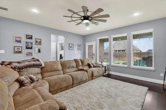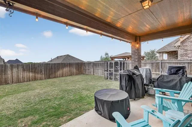 Step out back to your private outdoor oasis! The fantastic covered patio features warm string lighting and a ceiling fan, offering the ultimate setup for weekend barbecues, dining al fresco, or relaxing around a fire pit. The expansive, fully privacy-fenced backyard provides ample lush green space for pets, play, or gardening.
