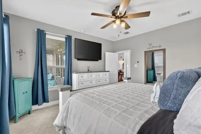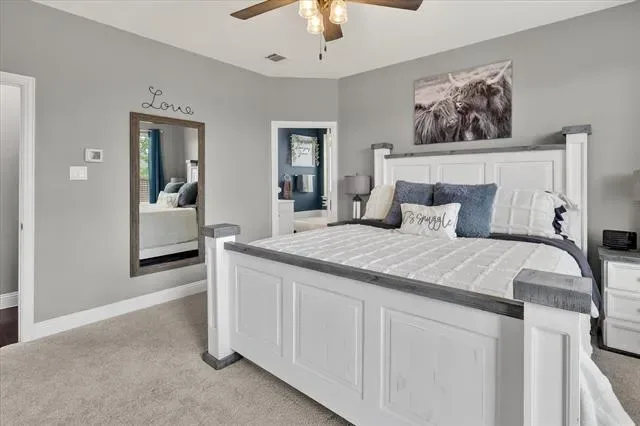 Retreat to the generously sized primary suite, offering a peaceful sanctuary with plush new carpeting, modern neutral tones, and a glimpse into a spa-like en-suite bathroom complete with a luxurious soaking tub.
