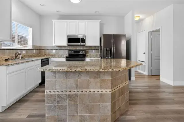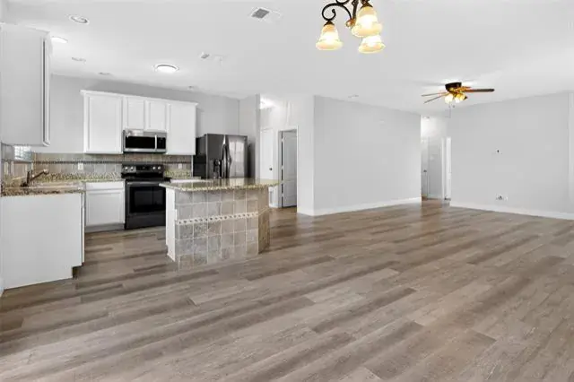 The spacious kitchen is perfect for entertaining, featuring granite countertops, a large island with breakfast bar seating, and seamless flow into the living room and dining area—ideal for gatherings and everyday living.
