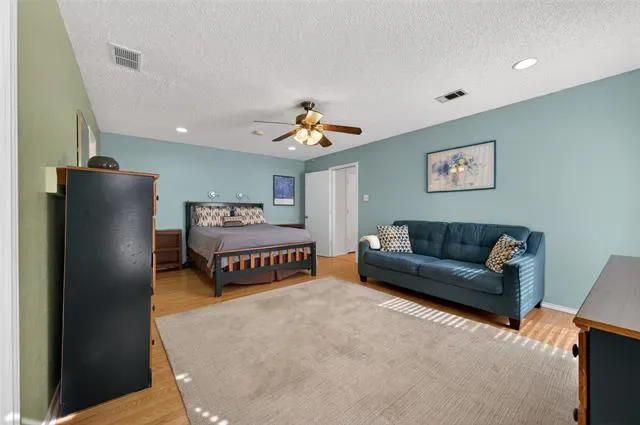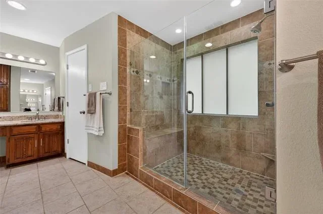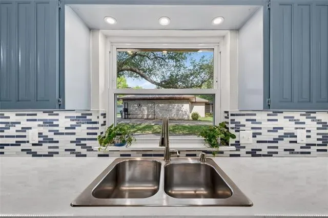 The kitchen blends style & function with quartz counters, blue cabinetry, under-cabinet lighting, double ovens, a stainless steel appliance package, & a peninsula that opens to the breakfast area. Just beyond, a built-in china hutch adds character, storage, & a custom touch that is rarely found. Both baths feature granite counters, while the primary suite includes double sinks, dual closets, & an oversized walk-in shower wrapped in tile for a clean, timeless look. Low-E vinyl windows throughout add comfort & efficiency, & the separate laundry room includes an extra closet for practical storage.