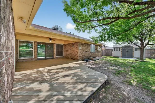 Out back, the setting becomes the story. A newly built deck extends into the yard, creating a natural place for morning coffee, evening dinners, or relaxed weekends under the shade of mature trees. The yard backs to a community park with walking trails & a creek, bringing a peaceful green backdrop right to the fence line. A storage building with a concrete slab adds useful bonus space, while the rear-entry garage includes workbench space, a manual side gate, & extra parking outside. Established, well-kept, & close to shopping, dining, & everyday conveniences, this home offers distinctive style, & thoughtful updates.